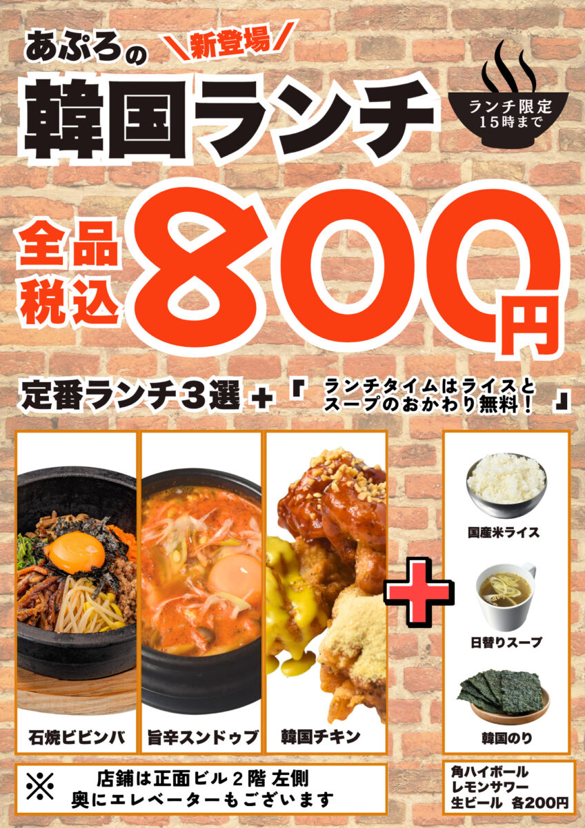 あぷろの韓国ランチ 800円(税込)ライス・スープのおかわり無料+韓国のり付